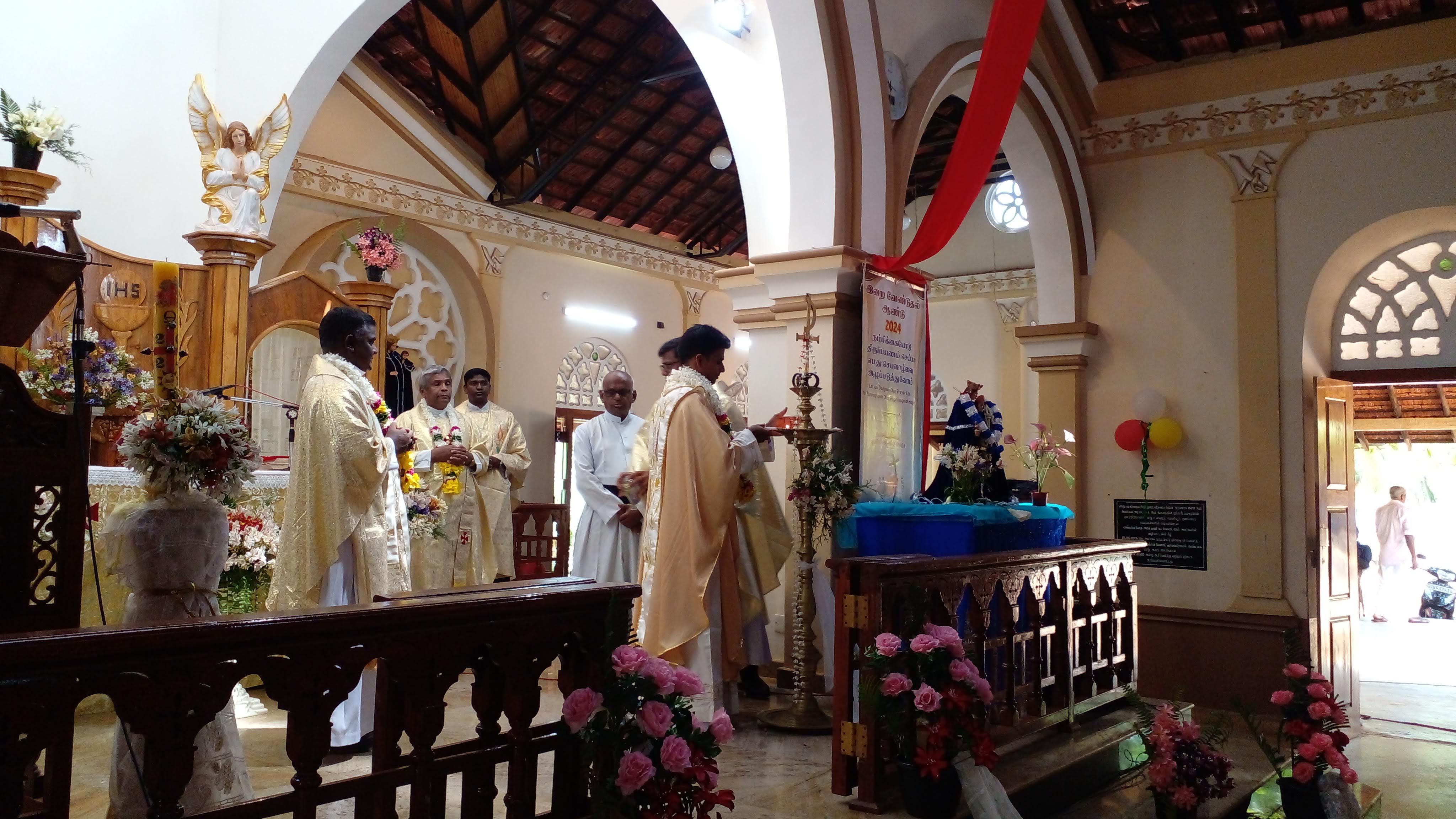 The Sixth Sunday of Easter in 2024 was a splendid day for the parishioners of St. James’ parish, Ilavalai as they welcomed their son of their soil, Revd. Fr. Sabarathinam Santana, SSS., who was ordained on the 27th April, 2024 at St. Philip Neri’s Church, Pettah, Colombo -11, by His Lordship Right Revd. Dr. Anton Ranjith Pillainayagam, the Auxiliary Bishop of Colombo. On Sunday the 5th of May, on a beautiful luminous morning at 10.00 a.m. the parishioners together with the parish priest, Revd. Fr. Christopher George Jeyakumar, several priests and religious and people of the neighboring parishes gathered at St. Anne’s junction, Illavalai to welcome the newly ordained priest. When Fr. Santana, sss., arrived at the welcoming point with the religious of the Blessed Sacrament Congregation, the parish priest formally welcomed the new SSS priest with a kiss and embrace and then he was garlanded and escorted to the parish church with the cultural dances and music.