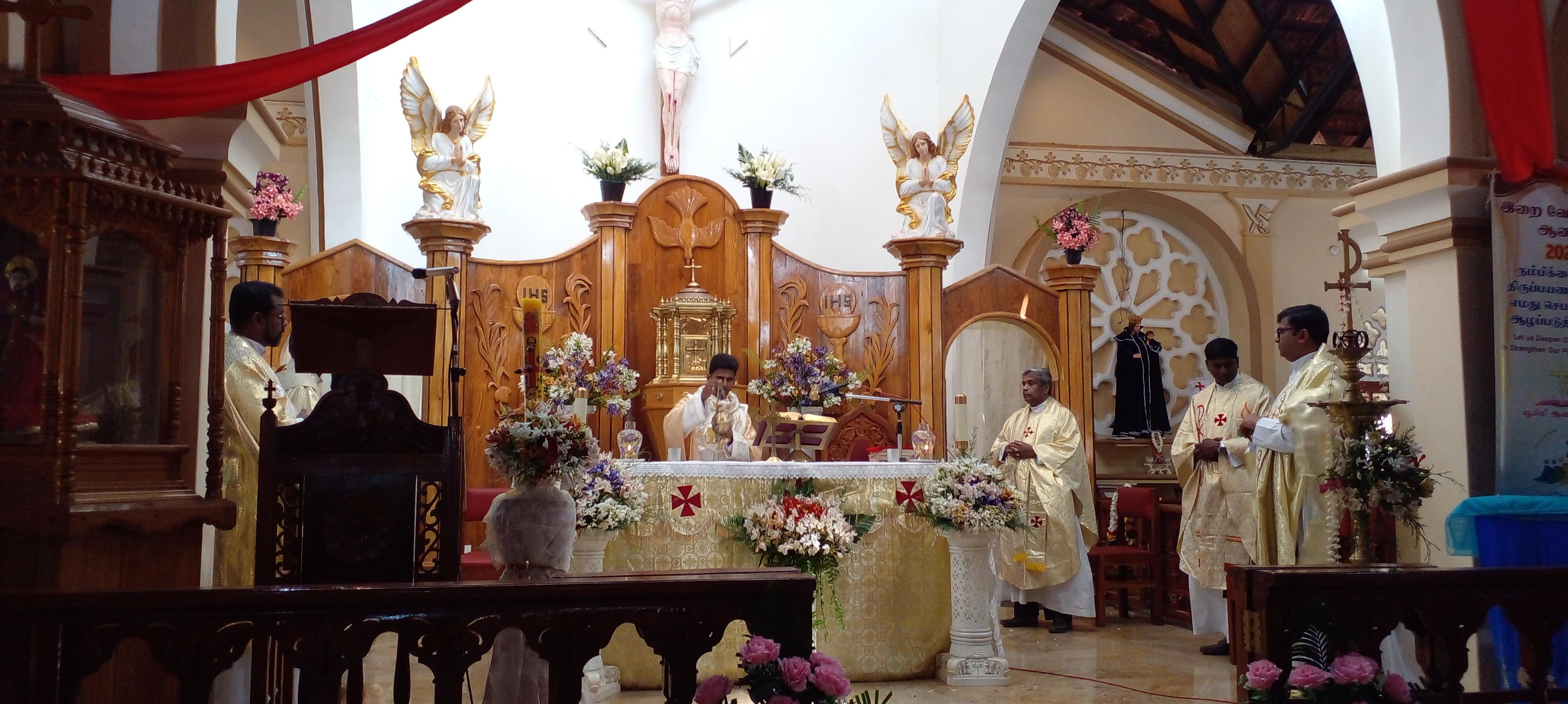 The First Thanksgiving public Mass of the 14th priest of St. James’ Church, Ilavalai began at 10.40 a.m. Several priests concelebrated with the newly ordained priest and hundreds of faithful participated at the Holy Mass. Revd. Fr. Mangalathasan Gnanapragasam, SSS., was the preacher for that special occasion and in his fabulous homily he highlighted on the gift of vocation, important of ministry and challenges had to face by priests. Obviously, Fr. Santana celebrated the Mass with overwhelming piety, serenity and confidence.
